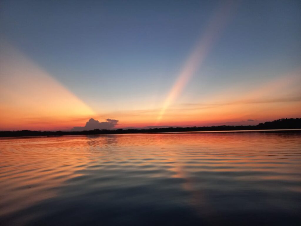 Later, we’ll head to Laguna Grande, a 30-minute canoe ride away, to explore the ‘Igapó’ flooded forest. You can swim in the calm waters and enjoy the Amazonian sunset. As night falls, we’ll observe nocturnal wildlife like bats and caimans before returning to the lodge for dinner, where our guide will brief us on the next day’s activities.